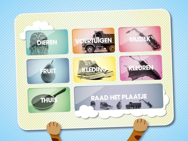 In de app 'Leer mij woorden' leert je kind hoe voorwerpen of dieren heten en wat voor geluid ze maken. Je kind hoeft alleen maar de afbeelding aan te raken
