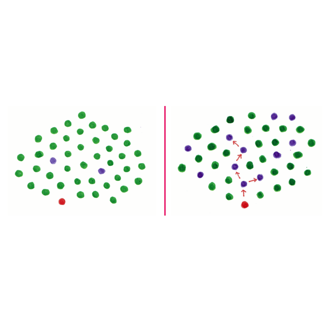 Links: twee mensen die niet zijn gevaccineerd en een besmetting. Rechts: meerdere mensen die niet zijn gevaccineerd en een besmetting.